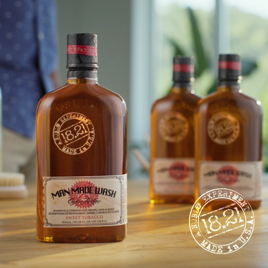 Our original 18.21 Man Made Sweet Tobacco 3-in-1 body wash, shampoo, and conditioner is inspired by the spirit of swanky, Prohibition-era speakeasy lounges. Revel in the masculine scent of sweet Virginia pipe tobacco while enjoying a moisturizing lather that’s perfect for all skin and hair types.