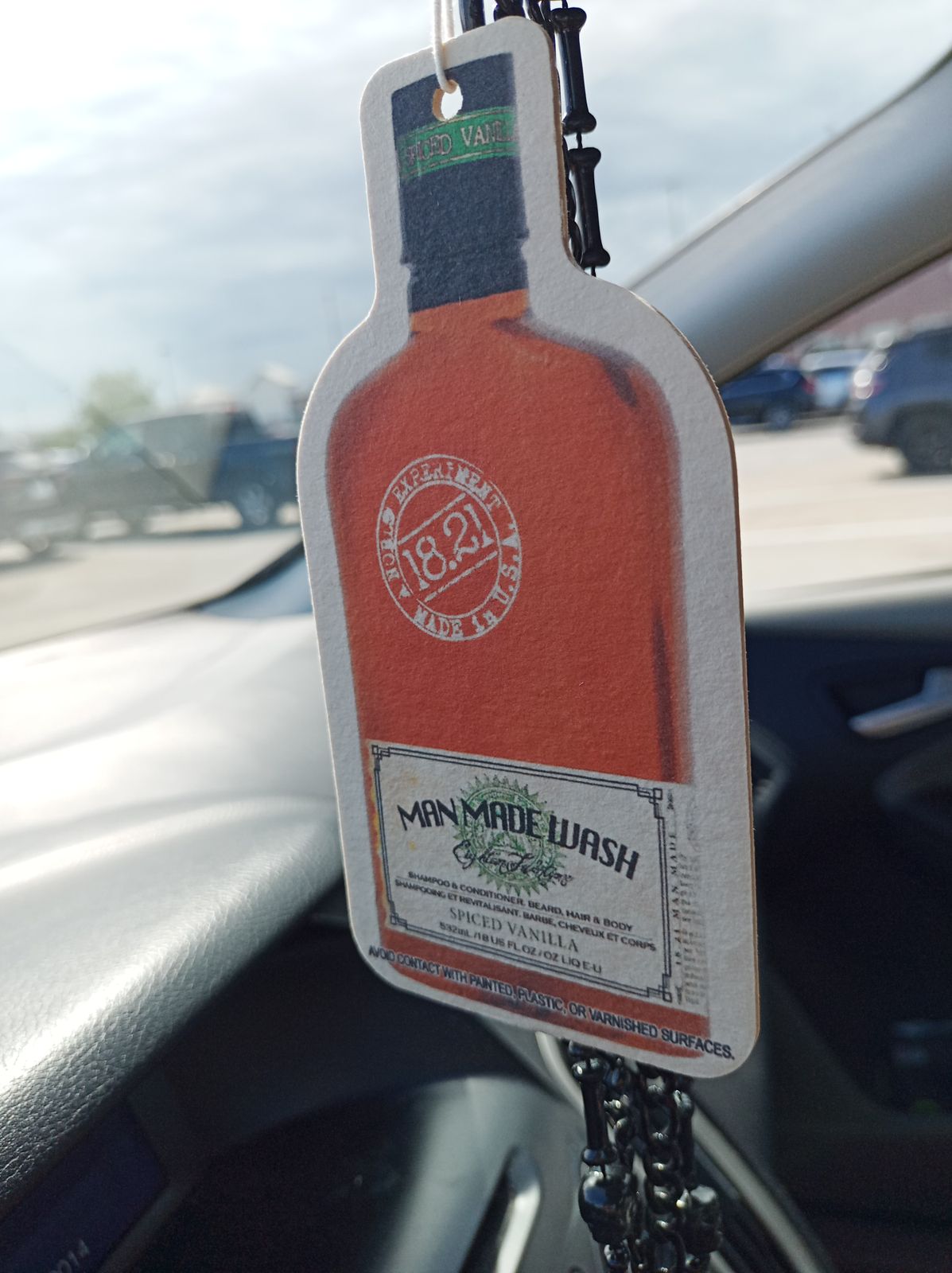 Modeled after our iconic 18.21 Man Made™ Wash bottle, this Spiced Vanilla car and air freshener releases our legendary barrel house fragrance with an admirable scent throw to complement the masculine smell of your favorite 18.21 Man Made products.
